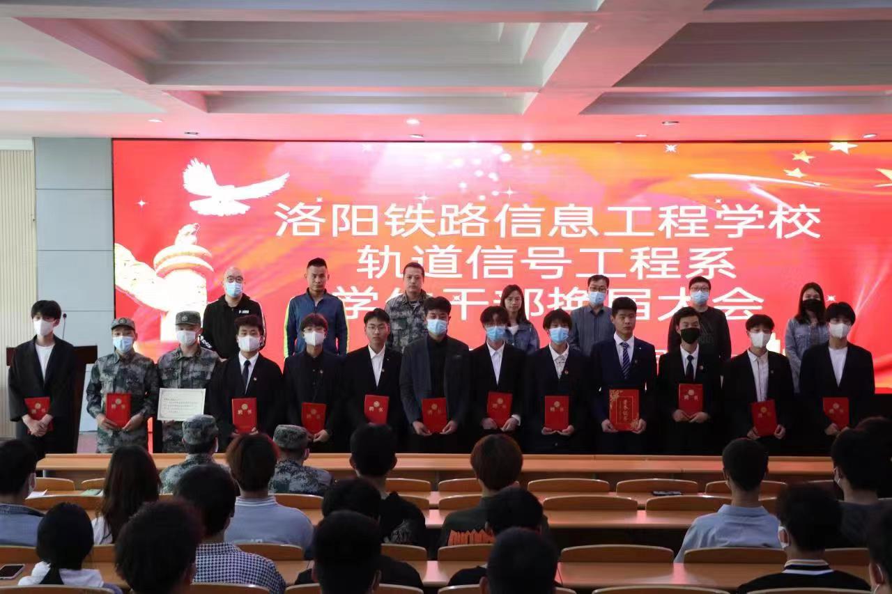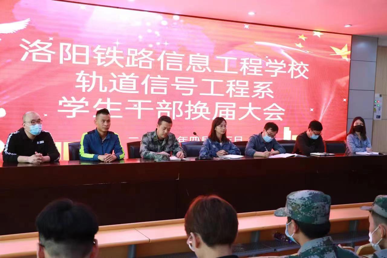4月13日下午,轨道信号工程系在一号教学楼思政大讲堂举行学生会换届聘任表彰大会,轨道信号工程系主任张建平、系学生管理副主任马瑞、教学副主任李福建,宿舍总教官李常青出席了会议。系学管干事王笑禹、金鲁中、王继光以及系全体学生干部参加了此次会议。