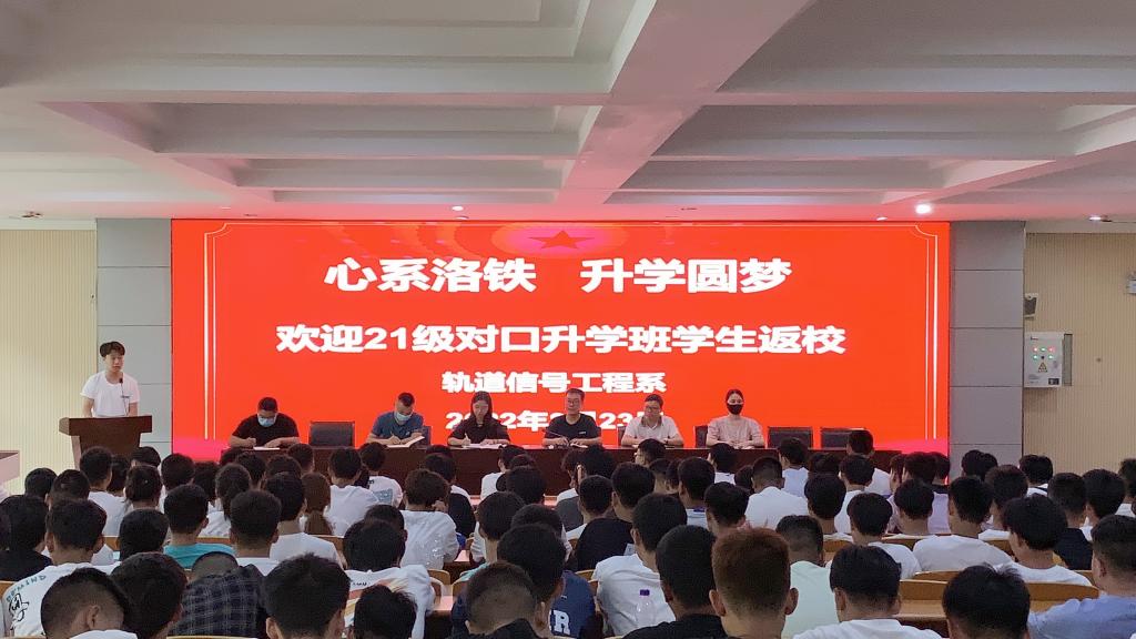 8月23日下午,轨道信号工程系在思政大讲堂召开了“心系洛铁,升学圆梦”21级对口升学班学生返校欢迎会,轨道信号工程系党支部书记、系主任张建平,教学主任李福建,学管主任马瑞以及系学管老师、全体学生干部、2021级对口升学班学生参加会议,会议由学管干事王希发主持。