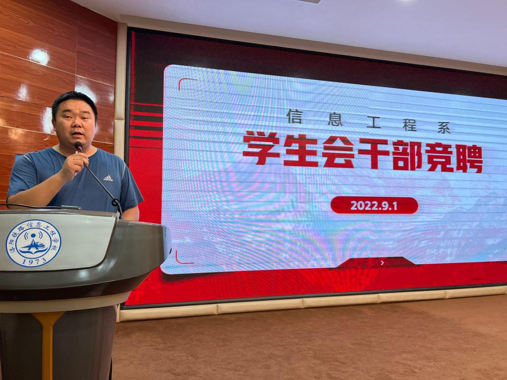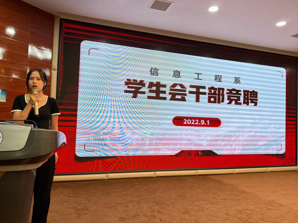 9月1日下午,信息工程系学生会干部竞聘大会在智慧大讲堂成功举行。信息工程系主任邱智铖,副主任臧嘉琦、郑波涛,系办公室老师及参与竞聘的19位候选人参加本次大会。大会由系学管老师陈英堃主持。