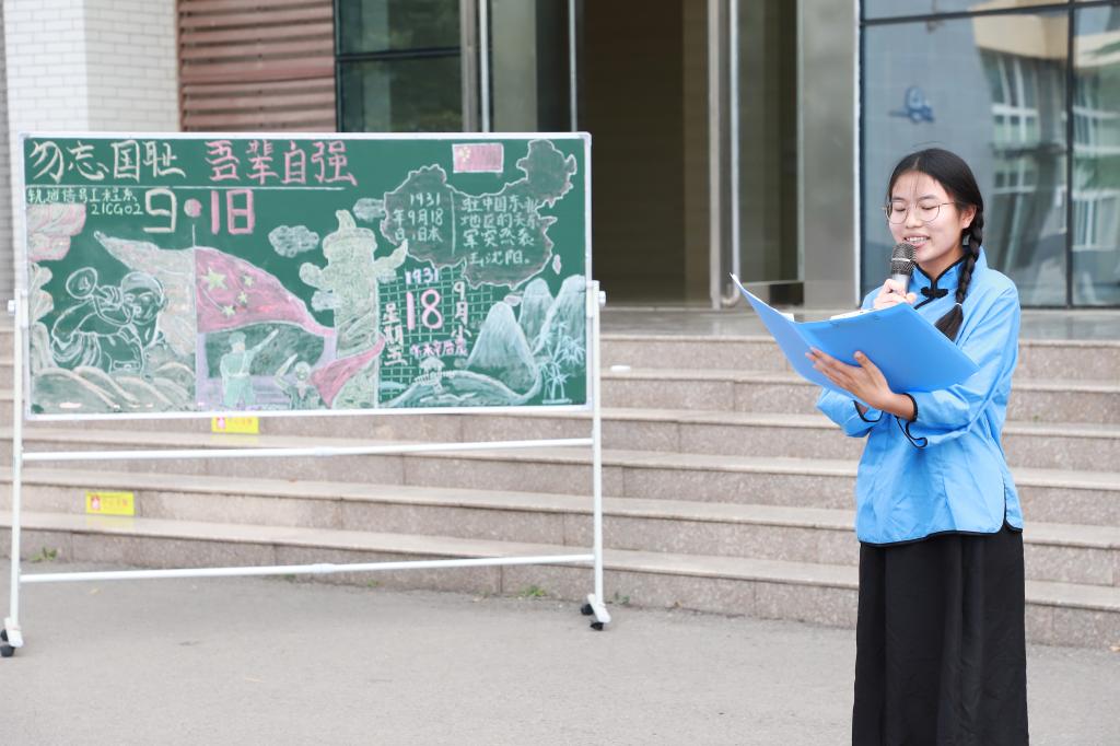 活动开始,全体师生肃立行注目礼、奏唱国歌,默哀一分钟缅怀遇难者同胞,面向团旗郑重宣誓。2021城轨02班王迎笑同学为大家带来《勿忘国耻 吾辈自强》演讲,马瑞为大家带来《少年中国说》朗诵,希望同学们珍惜当下的幸福生活,发奋图强,振兴中华。