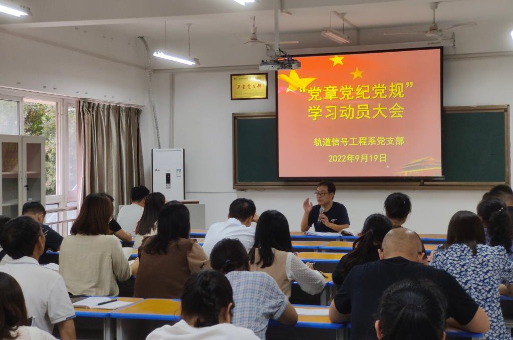 9月19日下午,轨道信号工程系党支部在一号教学楼238党员活动室开展了“党章党纪党规教育”学习动员会,轨道信号工程系全体党员参加,会议由系党支部书记张建平主持。