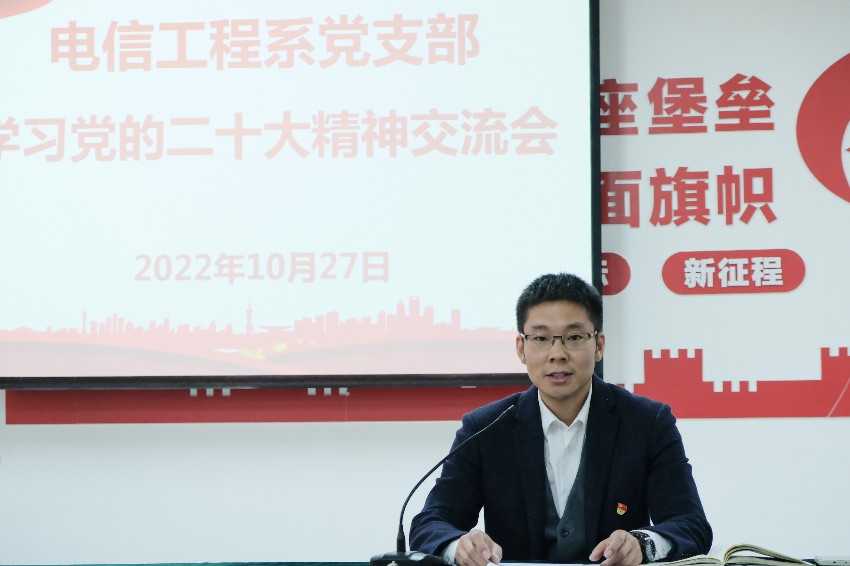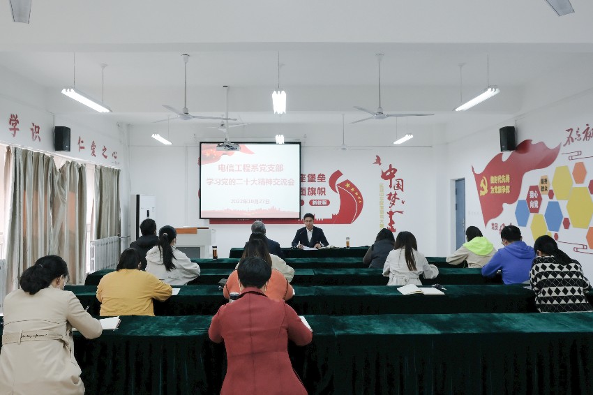 10月27日下午,电信工程系党支部在2号教学楼党员活动室开展政治理论学习暨党的二十大精神学习交流会,电信工程系党支部全体党员参加,会议由党支部书记张波主持。