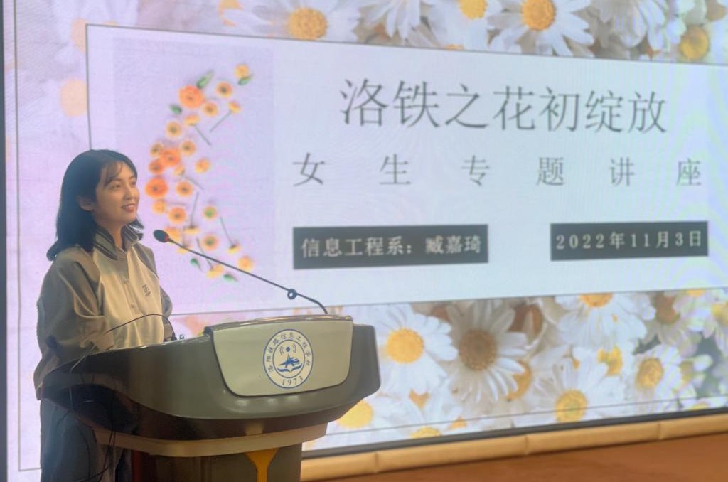 为引导女生正确认识青春期,信息工程系“五五四零一”特色晚自习之女生讲座第二场于11月3日开讲。讲座以“洛铁之花初绽放”为主题,由信息工程系副主任臧嘉琦主讲,2022级全部女生聆听了本次讲座。