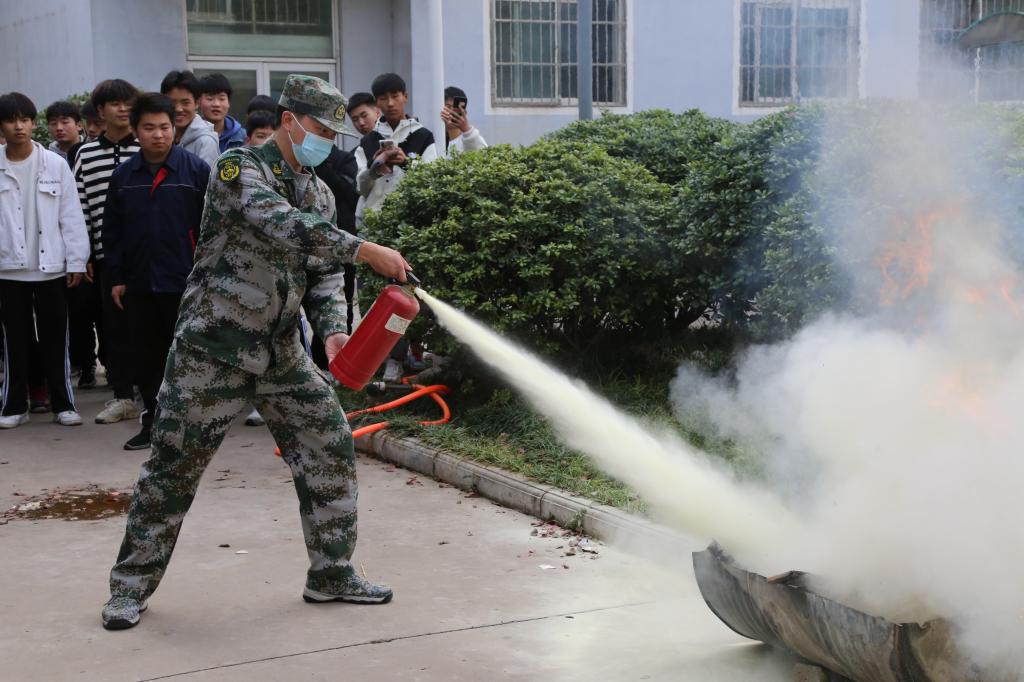 张端立强调,为抓消防安全,保校园平安,我校一直坚持定期组织学习消防安全知识、技能,有组织、有计划地开展消防疏散演练,消除身边的火灾隐患,确保校园安全。接着,张端立介绍了干粉灭火器的使用四步曲:“一提”握住灭火器提把手,“二拔”拔掉灭火器提把上的保险销,“三压”距火点5-6米处,压下把手,“四喷”对准火源根部左右喷射。
