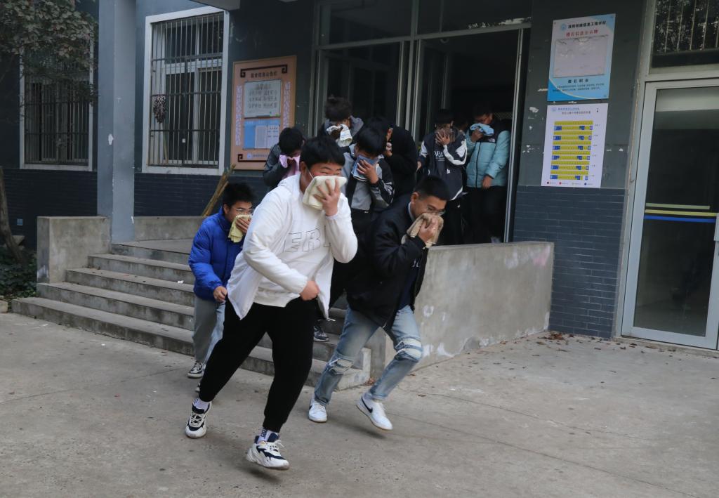 讲解演示结束后,军事思政教官们组织学生网格员进行了灭火和疏散演练。学生们听到警笛声,迅速用湿毛巾捂住口鼻有序下楼,迅速远离“失火”建筑物;整个过程井然有序。