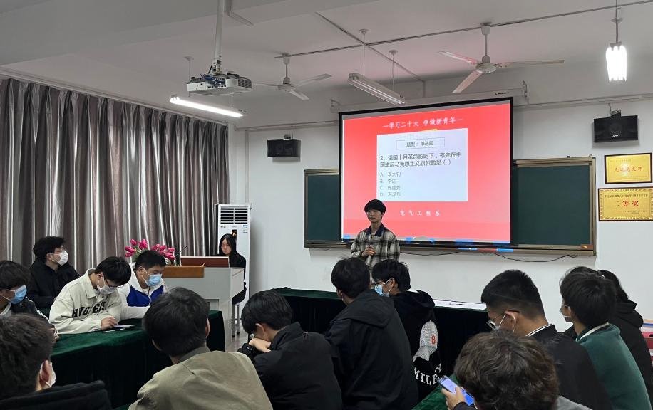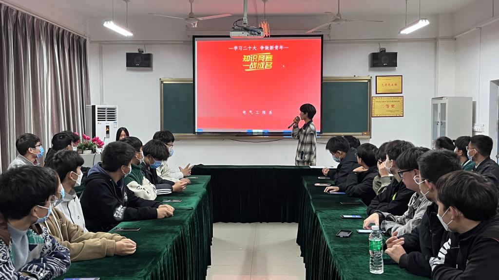 为深入学习贯彻宣传党的二十大精神,引领广大青年坚定信心跟党走,营造自觉学习、自觉遵守、自觉践行的良好氛围,电气工程系组织第48期入团积极分子和团学干部,于11月8日晚在1号教学楼338教室开展了“学习二十大 争做新青年”知识抢答竞赛,活动由2021级机器02班栾永豪同学主持。