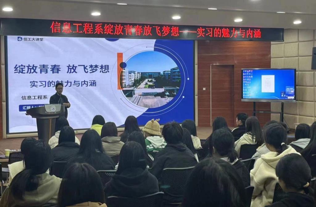 为确保2021级毕业生实习工作稳步推进,引导学生认识实习的目的和意义,信息工程系“五五四零一”活动之信工大讲坛于2月21日晚在智慧大讲堂举办。此次讲坛主题为“绽放青春,放飞梦想”,由信息工程系副主任郑波涛主讲,2021级、2022级全体学生聆听。