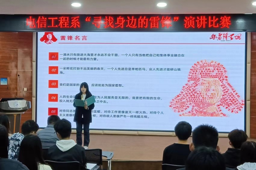 为进一步弘扬雷锋精神,引导广大青年学生准确把握雷锋精神的深厚意蕴和时代内涵。3月23日下午,电信工程系在智慧大讲堂举办“寻找身边的雷锋”主题演讲比赛,电信工程系学管主任陈志坚、第49期业余团校部分学员和电信工程系学管干事、各班团支书参与此次活动。