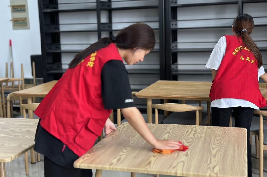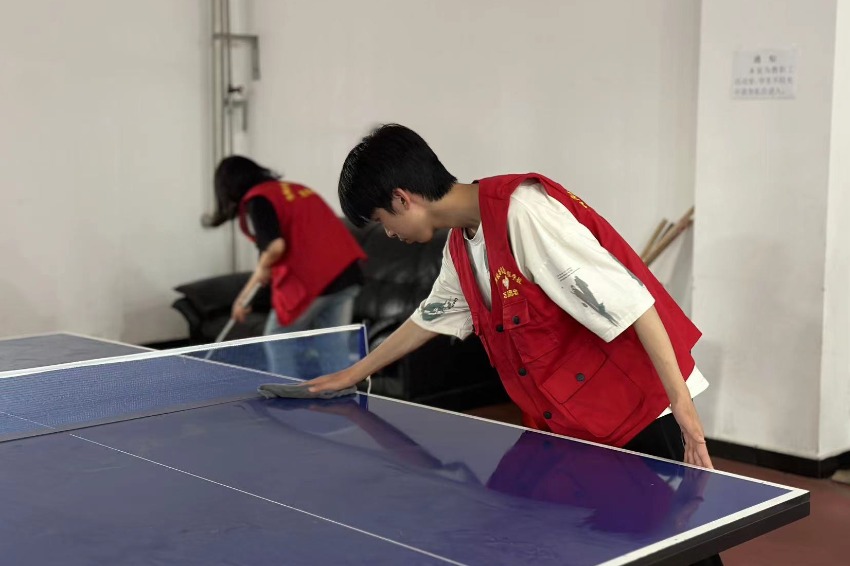 活动过程中,同学们分工明确,任务划分到个人,他们对阅览室和活动室的地面、桌面、健身器材进行了认真细致的打扫,各位同学踏实负责,被打扫后的房间焕然一新,让老师们在阅读和锻炼时更加舒心。