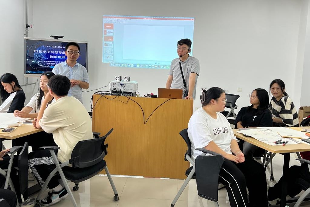 为更好地实现人才培养目标,提高人才培养质量,实现学校与企业的合作互赢,9月19日上午,河南飞天电子商务有限公司一行来到信息工程系,为电子商务专业学生进行校外实训岗前培训。信息工程系副主任郑波涛、电子商务教研室及计算机教研室教师参加,岗前培训由郑波涛主持。