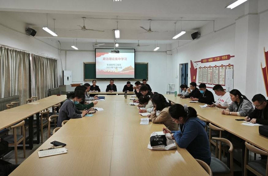 10月23日下午,在1号教学楼238室召开轨道信号工程系政治理论学习暨全系工作会议,轨道信号工程系全体教师参加。