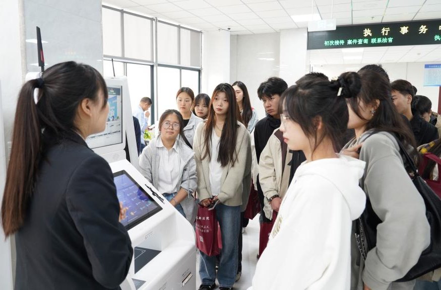 进入法院,同学们被法院浓厚的法治氛围所吸引,在工作人员的带领下,先后参观了诉讼服务中心、法治文化长廊、综合审判庭等。在诉讼服务大厅同学们聆听立案服务及智能化立案设施介绍,观看诉讼自助服务终端等智能设施的操作演示,体验了科技给诉讼服务带来的新感受,了解了诉讼服务中心职能和司法便民利民举措。在审判法庭,法官向大家讲解了审判法庭的构成,重点介绍了法官、陪审员、书记员、法警、公诉人及辩护人各自承担的职责。同学们聚精会神观摩,虚心请教问题,用心感受法律的庄严和权威。