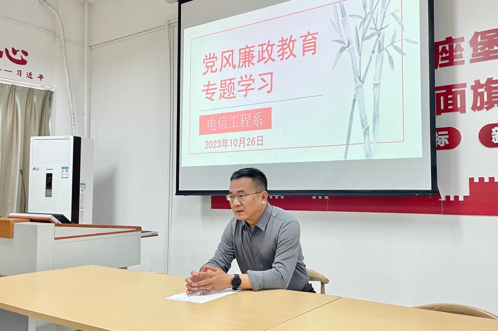 为进一步落实党风廉政建设各项工作任务,全面加强作风建设,10月26日下午,电信工程系党支部在2号教学楼党员活动室组织开展党风廉政教育专题学习,全体党员参加会议,会议由党支部副书记陈志坚主持。校党委副书记、副校长于庆斌以普通党员身份参加会议。