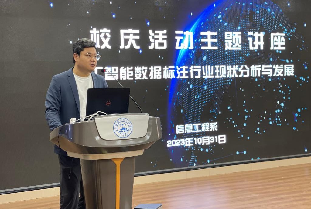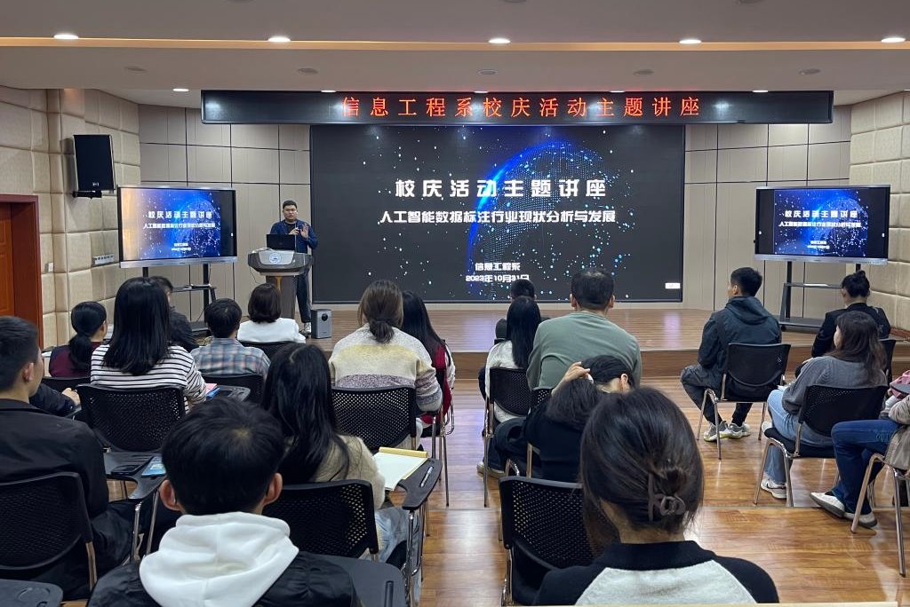 为庆祝我校建校50周年,10月31日下午,信息工程系在智慧大讲堂召开了校庆活动专题讲座,举办了以“人工智能数据标注行业现状分析与发展趋势”为主题的讲座。本次讲座旨在探讨人工智能数据标注行业的最新发展动态,为学生和教师提供了解该行业的机会,同时也为企业提供了交流合作的平台。讲座由系主任邱智铖主持,深航大数据精算技术有限公司负责人张梁主讲,系全体教师及30名学生代表参加。