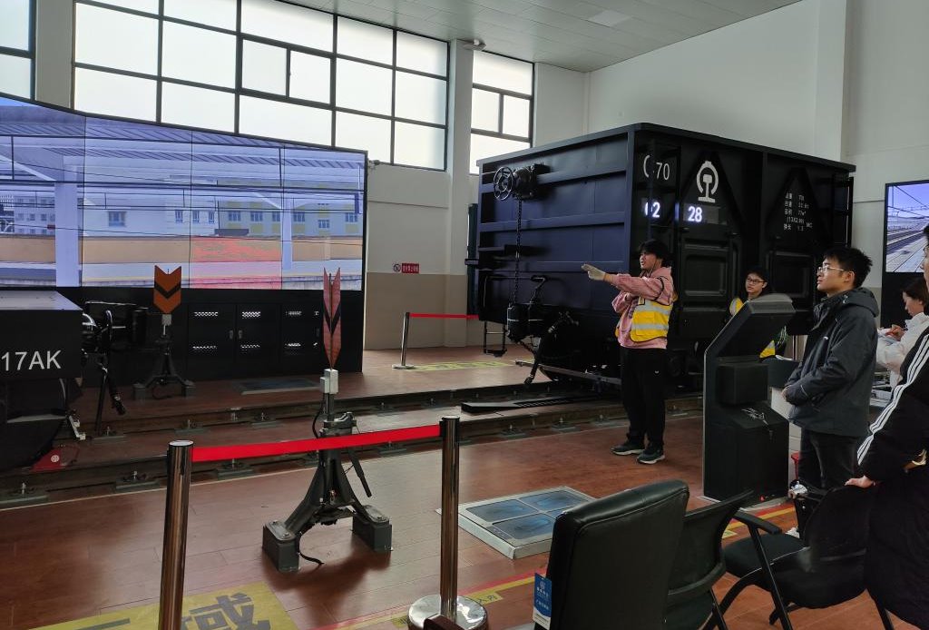 在工作人员的带领下,师生参观了职工培训基地。工作人员重点演示了铁路调车作业实训平台,该平台是面向区域调车长、调车长、连结员等相关岗位的职工培训。师生共同体验了相关岗位工作,工作人员耐心指导操作要领,并向大家介绍了新技术和新设备。