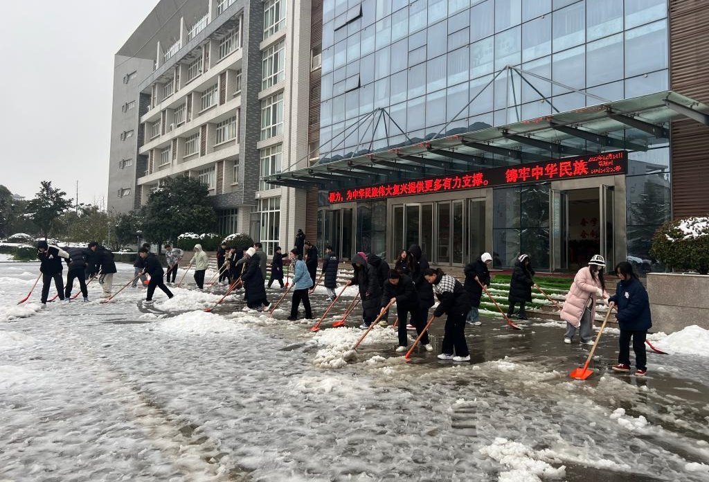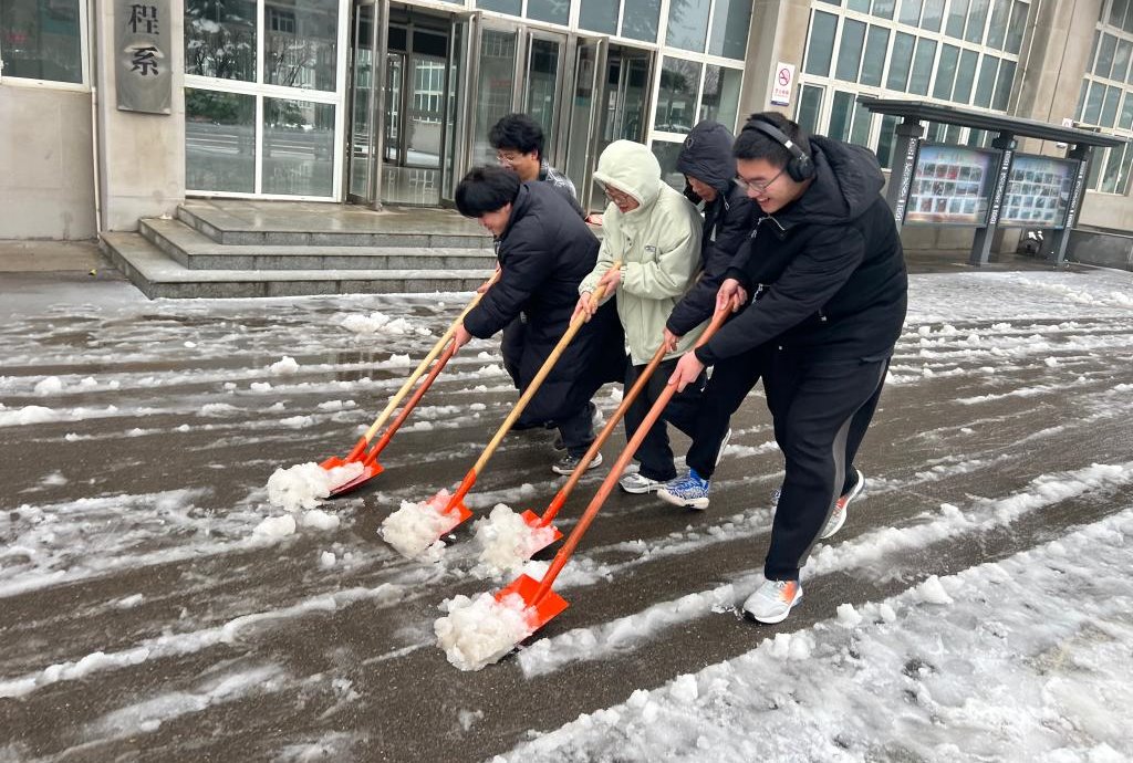 12月14日上午,新一轮寒潮天气带来的强降雪、雨、冰雹交织降下,为防止低温天气造成路面结冰湿滑,对师生教学、学习和生活产生安全隐患。下午2点,公共教学部组织劳动教育实践课同学开展“开路·破冰”活动。