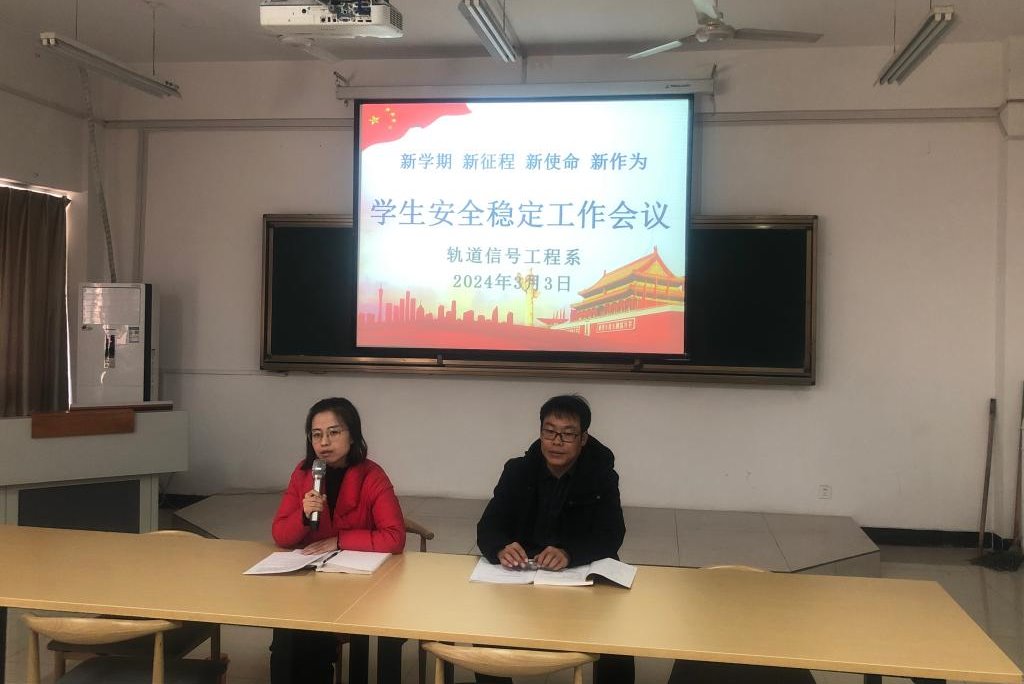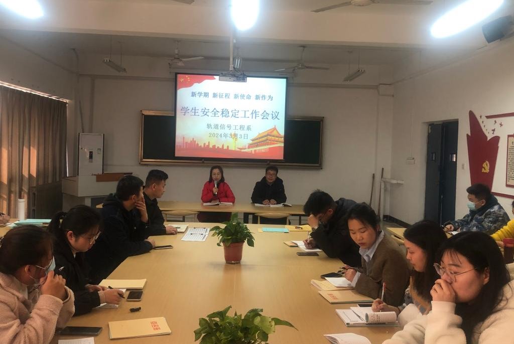 3月3日下午,轨道信号工程系在1号教学楼238室召开了主题为“新学期 新征程 新使命 新作为”暨学生安全稳定工作会议,轨道信号工程系主任张建平、学管主任马瑞、系办管理人员及全体班主任参加会议。