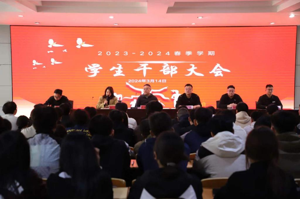 为进一步加强学生干部队伍建设,增强学生干部责任意识,促进学生组织联动,服务学生成长成才,3月14日下午,校团委在1号实训楼思政大讲堂召开2023-2024春季学期学生干部大会,副校长尹亚波、学生工作部部长李臻、团委书记杨帆和各系团总支书记、辅导员以及110余名学生干部参加大会,会议由杨帆主持。