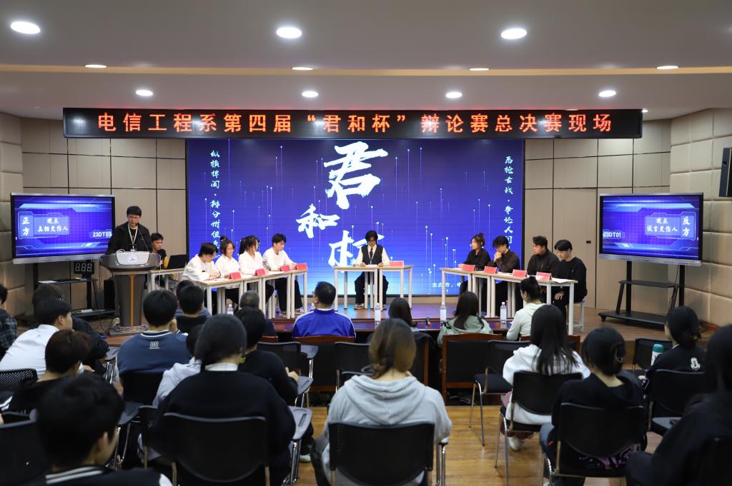为丰富同学们的校园生活、提高语言表达能力和逻辑思维能力,3月28日晚,电信工程系在智慧大讲堂举办第四届“君和杯”大专辩论赛总决赛。此次辩论赛评委的由电信工程系主任李琼,副主任陈志坚、李军华,学工部部长李臻,校团委书记杨帆等人担任。