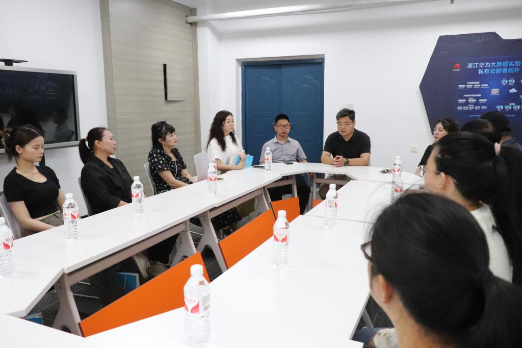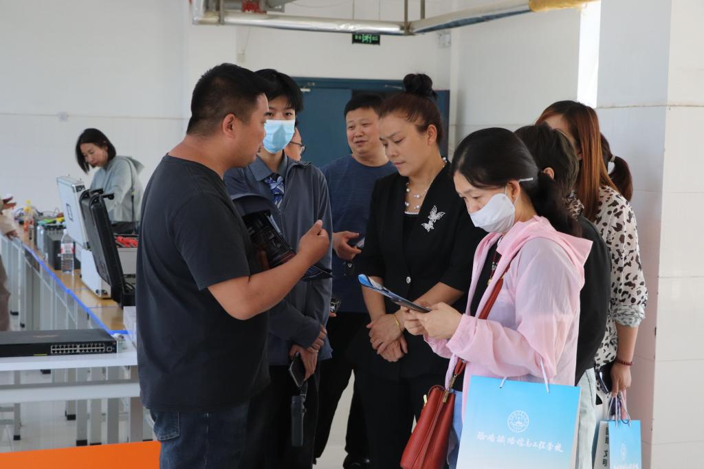 信息工程系教师引导来访家长参观视觉传达实训室,电商直播实训室、大数据产业学院等专业特色实训室。
