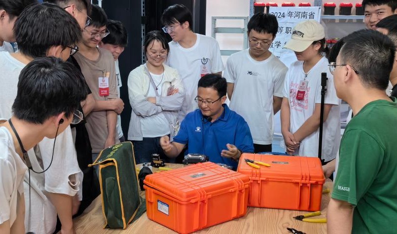 仪式结束后,参训师生立即投入到紧张而有序的培训学习中。电信工程系老师孙慧带领学生参观了中兴通信博物馆,并在5G移动通信实训中心进行了5G基站建设与维护的实操培训。牛广峰老师则为学生们讲授演示了通信基站建设与维护过程中的天馈线施工、光纤接续等相关内容,并指导学生们完成了光纤的熔接接续练习。此外,在牛广峰老师的带领下,参训师生还在“洛铁站”高仿真铁道施工安全教育实训基地参与了安全技能体验。参训师生们纷纷表示此次培训收获很大,对我校的实训条件和培训教师的专业水平都给予了高度的认可。