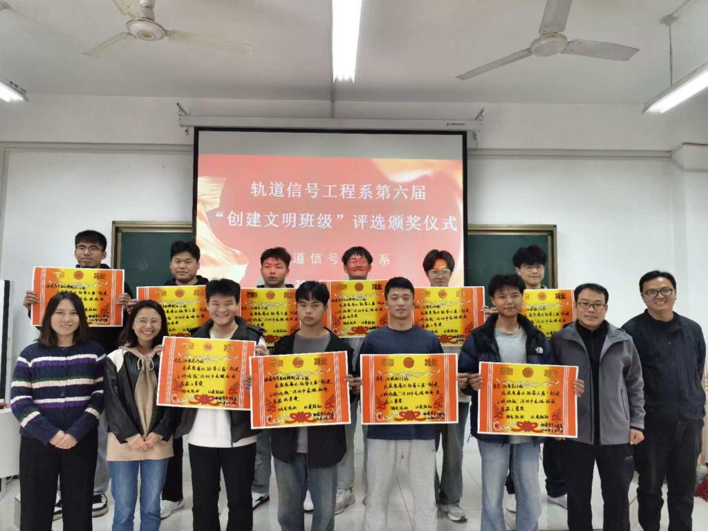 最终信号-24城轨02荣获一等奖,信号-24城轨01、铁道信号自动控制24-2荣获二等奖,信号-24信号02、信号-24信号04、信号-24信号09荣获三等奖,铁道信号自动控制24-5、铁道信号自动控制24-3、信号-24信号11、铁道信号自动控制24-4荣获优秀奖,系部为获奖班级颁发奖状和奖品。