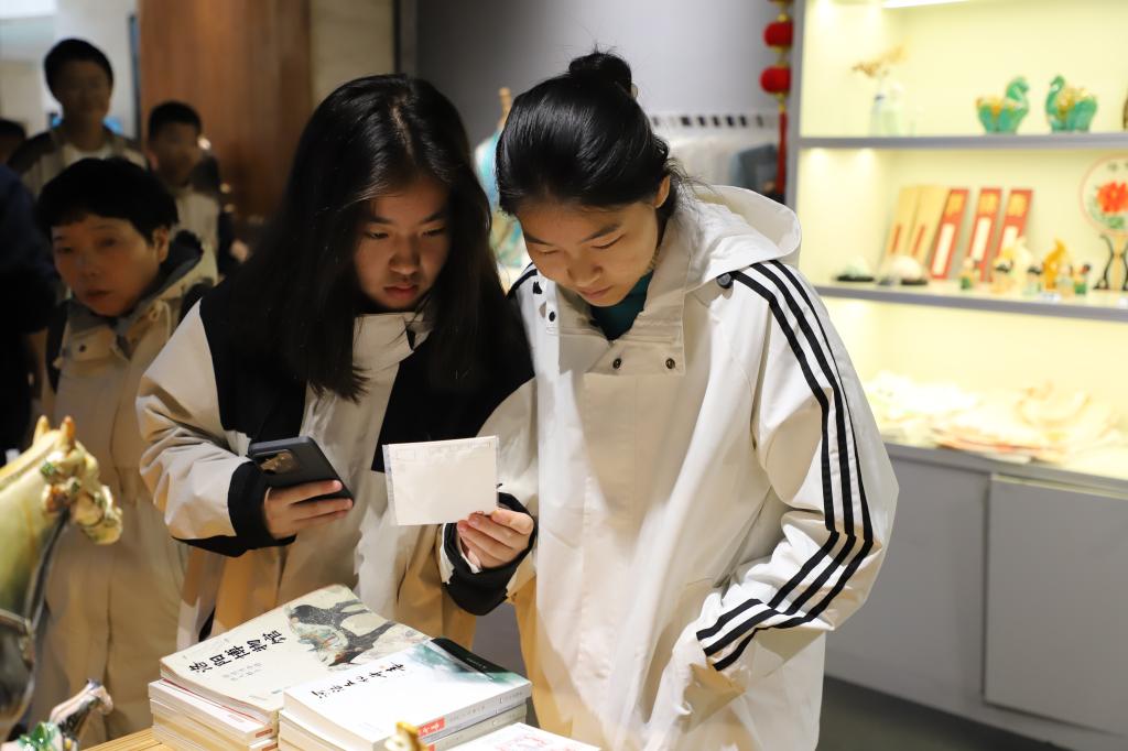 在博物馆内,同学们三五个人自行组队参观,从夏商周的青铜器,到汉唐的陶俑壁画;从精美的瓷器玉器,到珍贵的书法绘画,同学们都细致了解。特别是在馆内的文创邮局,同学们精挑细选明信片,并盖上邮戳将其寄出,感受不同通讯方式的魅力。