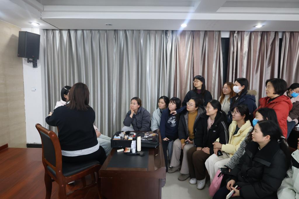 本次讲座通过两位老师的讲授和专业指导,帮助女性教职工掌握护肤与化妆技巧,展现新时代女性的优雅与魅力。