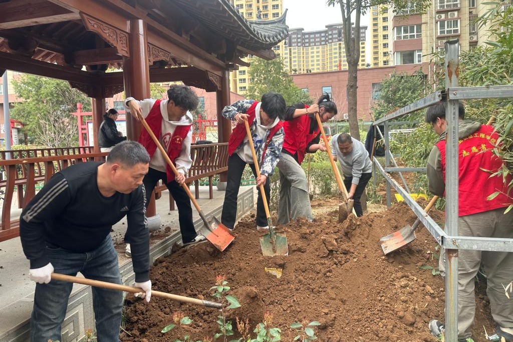 在老师们的带领下,志愿者们首先来到常村社区开展服务。同学们手持扫帚、抹布等工具,分组清理街道垃圾、擦拭公共设施。具备摄影特长的志愿者走街串巷开展爱心生活照活动,先后为15位老人、儿童提供义务拍照服务,细致周到的服务赢得居民连连称赞。随后在康庄社区,志愿者们积极参与到植树节社区活动当中,与社区工作人员共同栽种了十余株景观苗木,参与植树的志愿者们挥锹铲土、扶苗培土、提水浇灌。劳动中,社区工作人员还向大家介绍了树株的品种、植树技巧以及树木养护的方法,现场气氛十分热烈。老师们时不时与身边的同学们交谈,了解大家对开展植树、参与劳动的看法,鼓励同学们在学习之余多参加劳动。新绿的树苗与鲜艳的志愿马甲交相辉映,为社区增添了勃勃生机。