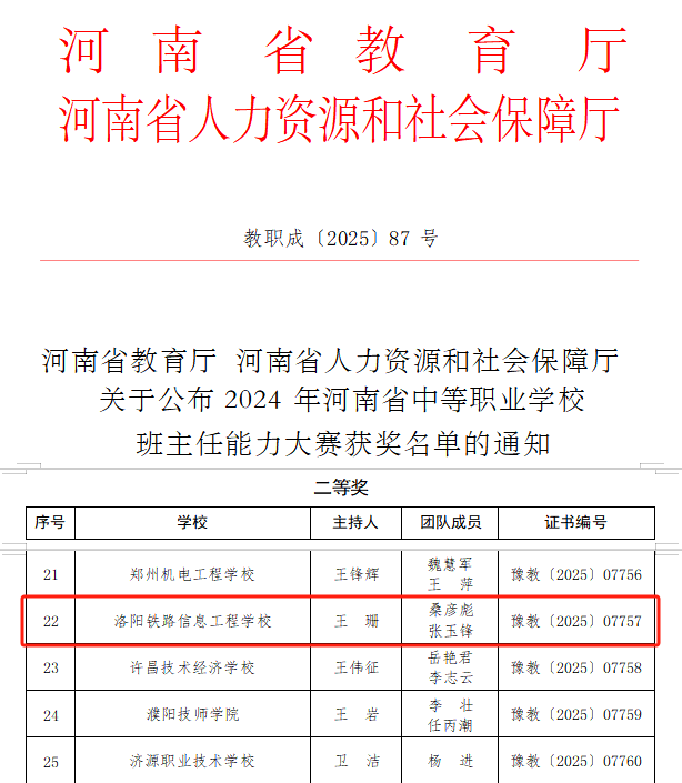 近日,2024年河南省中等职业学校班主任能力大赛决赛结果公布。由我校王珊、桑彦彪、张玉锋三位教师组建的班主任团队凭借出色表现,最终获得省级二等奖。