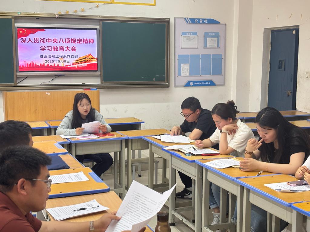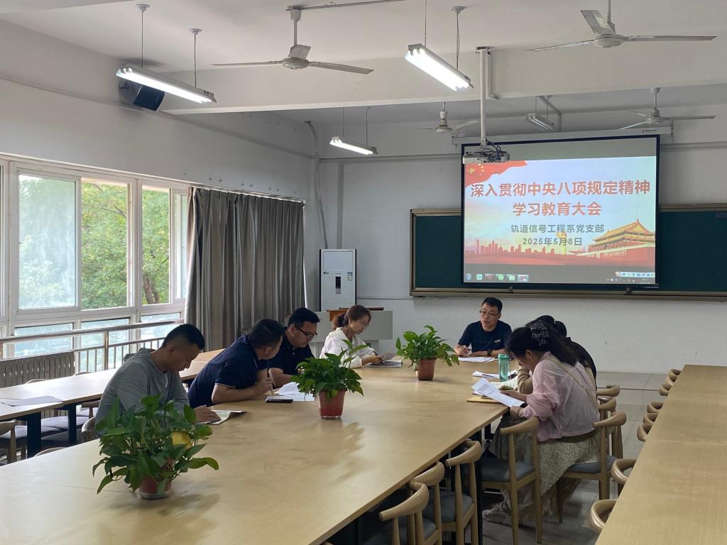 为深化全面从严治党,进一步强化纪律作风建设,5月8日,轨道信号工程系党支部组织召开深入贯彻中央八项规定精神学习教育会议,全体党员参加。