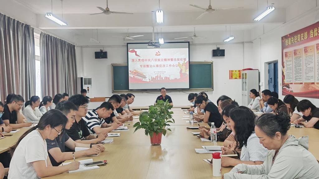 6月10日下午,电气工程系党支部在1号教学楼338党员活动室召开深入贯彻中央八项规定精神暨违规吃喝专项整治以案促改工作会议。电气工程系全体教师参加,会议由系党支部副书记、学管主任姚建华主持。