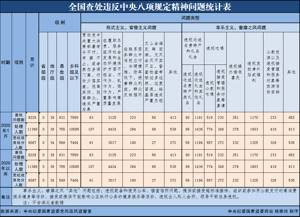 为掌握全国贯彻落实中央八项规定精神情况,中央纪委国家监委在各省区市和新疆生产建设兵团、各中央和国家机关、各中央企业和中央金融企业等建立了落实中央八项规定精神情况月报制度。2020年以来,截至1月31日,全国查处违反中央八项规定精神问题情况如下: