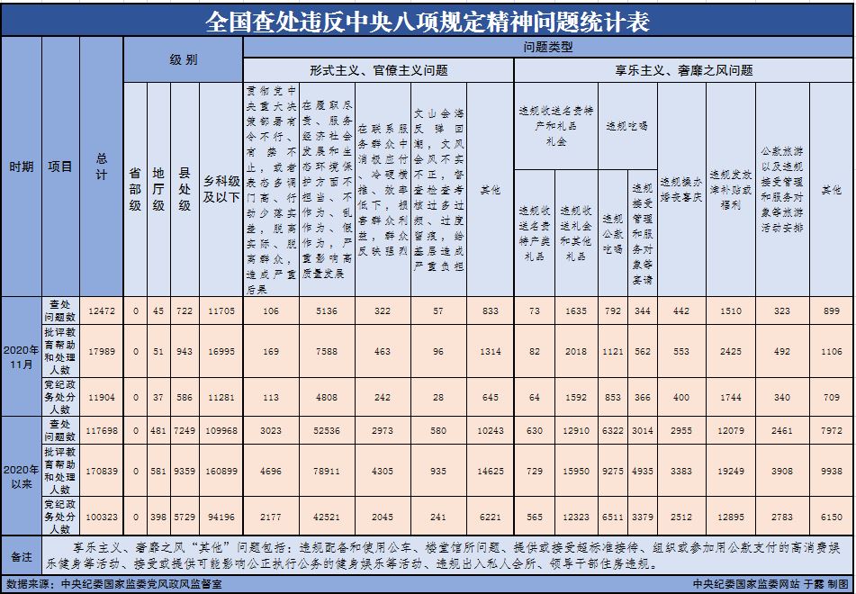 为掌握全国贯彻落实中央八项规定精神情况,中央纪委国家监委在各省区市和新疆生产建设兵团、各中央和国家机关、各中央企业和中央金融企业等建立了落实中央八项规定精神情况月报制度。2020年以来,截至11月30日,全国查处违反中央八项规定精神问题情况如下: