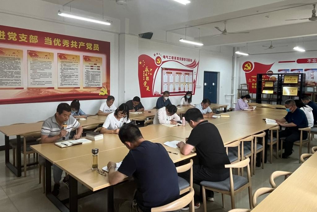 5月18日下午,电气工程系党支部在1号教学楼338室组织开展习近平新时代中国特色社会主义思想主题教育集体学习,支部全体党员参加会议。会议由系党支部副书记姚建华主持。