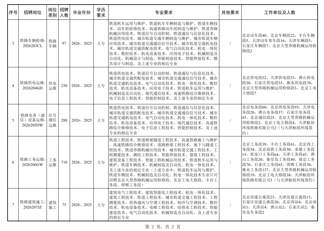 中国铁路北京局集团有限公司根据企业发展需要,招聘普通高校大专学历毕业生。具体事宜公告如下: